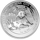 该枚纪念币背面图案为母子熊猫图,并刊“1oz Ag.999”字样、“西安市商业银行成立10周年纪念”英文字样及面额。