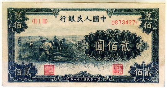 第一版人民币红200割稻
