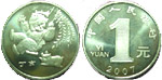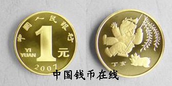 该纪念币正面刊“中国人民银行”、“1元”和汉语拼音字母“YIYUAN”及“2007”年号;背面主景图案为一个荡秋千的小女孩和一只小猪嬉戏的场景,内缘左下方刊“丁亥”字样。