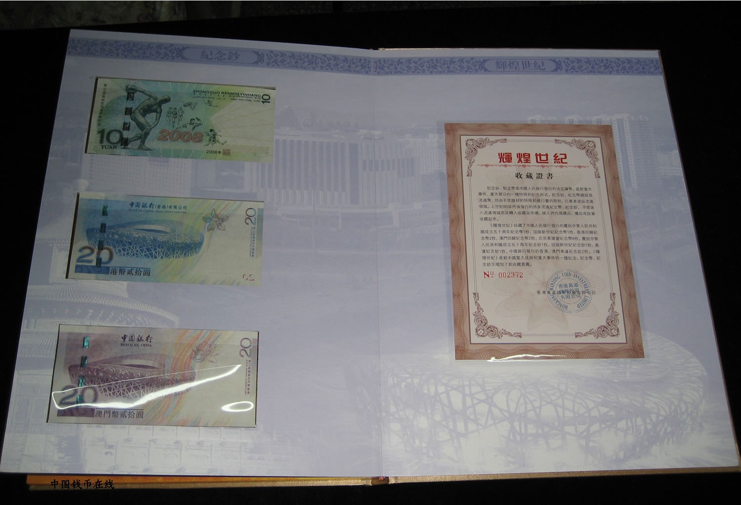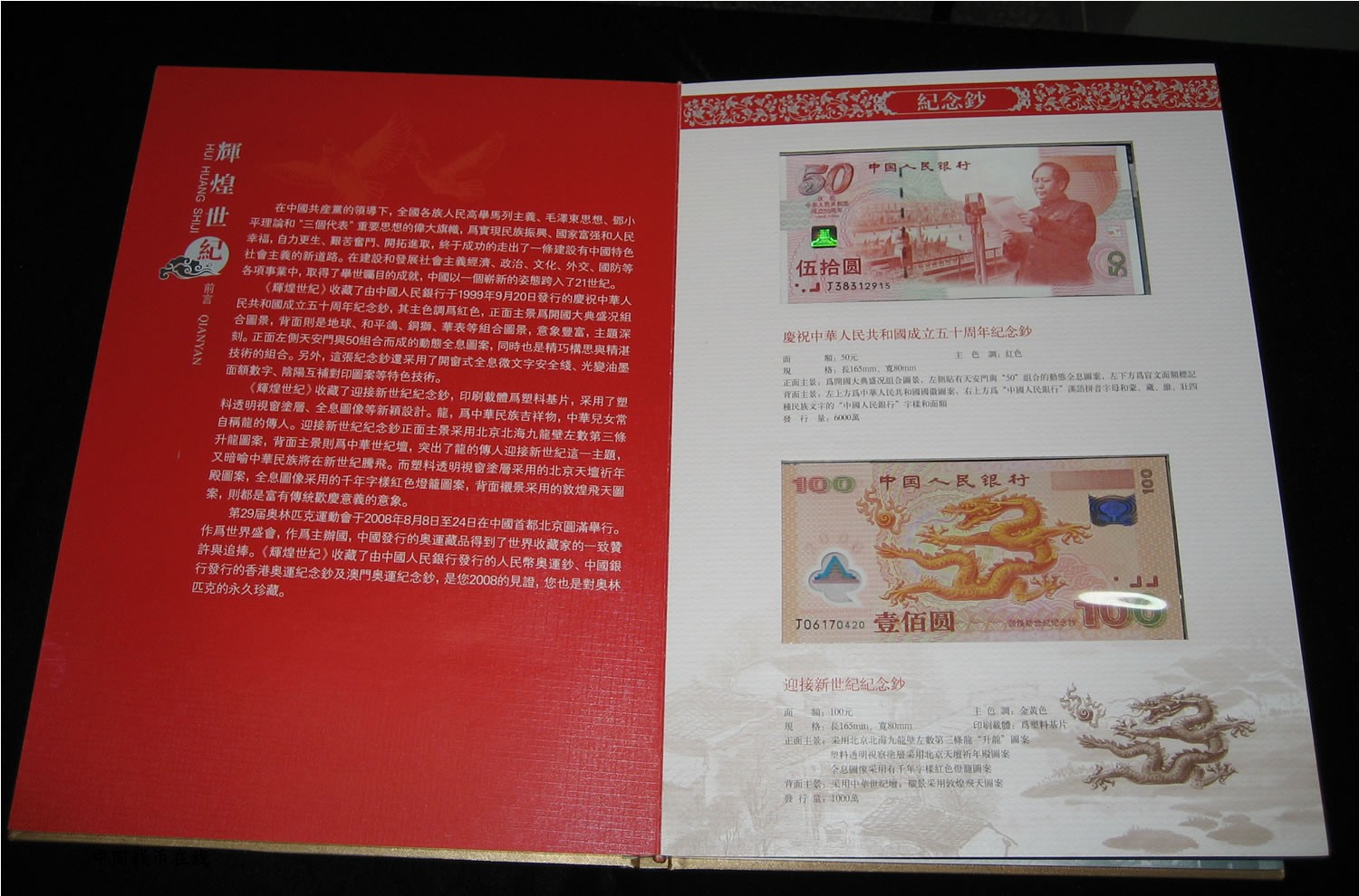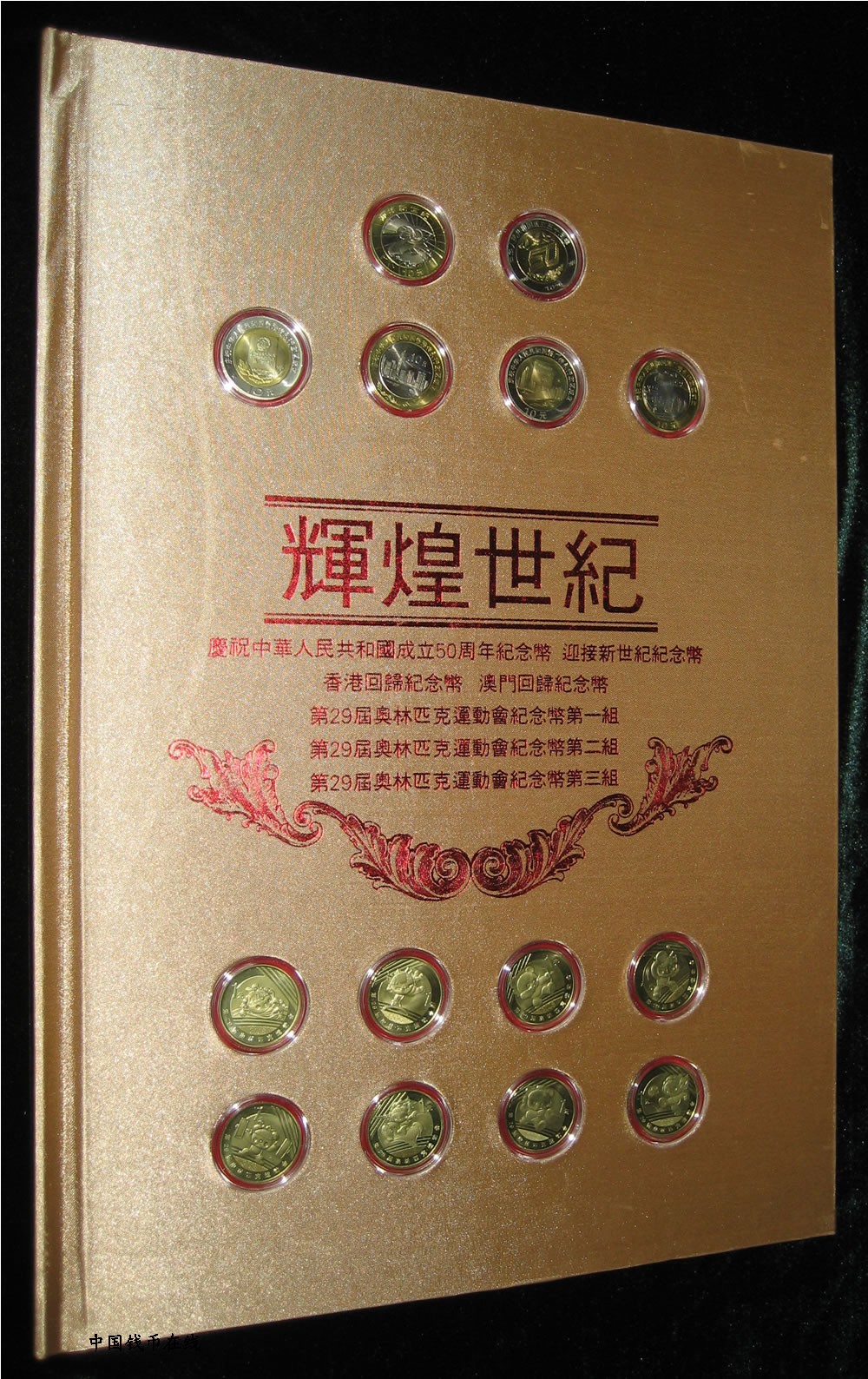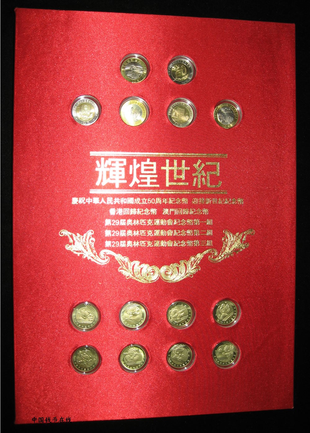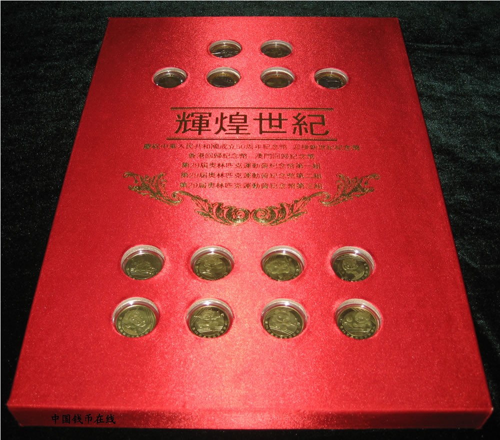 包括:香港回归纪念币2枚,澳门回归纪念币2枚,奥运纪念币8枚,建国50周年纪念币1枚,迎接新世界纪念币1枚,建国50周年纪念钞1张,迎接新世界龙钞1张,奥运纪念钞1张,香港奥运纪念钞1张,澳门奥运纪念钞1张.