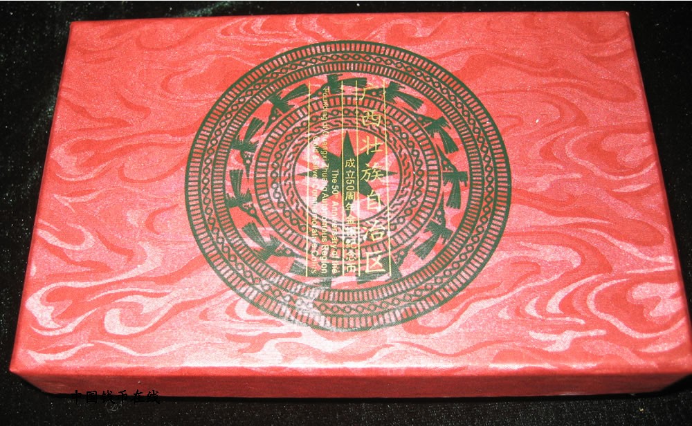 1/4盎司金质纪念币 面额(元) 材质 成色(%) 质量 重量(oz) 形状 直径(mm) 最大发行量(枚) 100 金 99.9% 精制 1/4 圆形 22 10000 正面图案 广西铜鼓鼓面图案,并刊国名、年号。 背面图案 广西壮族绣球与壮锦纹样装饰设计,并刊“广西壮族自治区成立50周年”壮文、汉文及面额。 1盎司银质纪念币 面额(元) 材质 成色(%) 质量 重量(oz) 形状 直径(mm) 最大发行量(枚) 10 银 99.9% 精制 1 圆形 40 20000 正面图案 广西铜鼓鼓面图案,并刊国名、年号。 背面图案 “中国—东盟博览会的永久会址南宁国际会展中心”建筑配以装饰线面及和平鸽组合设计,并刊“广西壮族自治区成立50周年”壮文、汉文及面额。