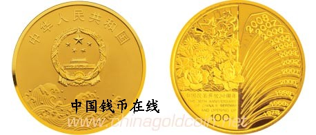 面额(元) 材质 成色(%) 质量 重量(oz) 形状 直径(mm) 总发行量(枚) 100 金 99.9 精制 1/4 圆形 22 30000 正面图案 中华人民共和国国徽与浪潮组合设计图,并刊国名、年号。 背面图案 百花、礼花装饰与象征改革开放历年进程的抽象图案组合设计,并刊“中国改革开放30周年”中英文字及面额。 1盎司银质纪念币