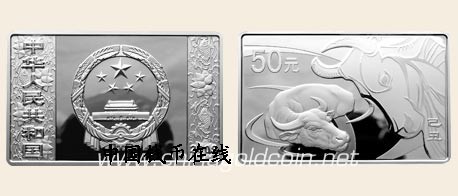 面额(元) 材质 成色(%) 质量 重量(oz) 形状 规格 最大发行量(枚) 50 银 99.9% 精制 5 长方形 80毫米×50毫米 1888 正面图案 中华人民共和国国徽衬以连年有余吉祥装饰花纹,并刊国名、年号。 背面图案 水牛水中嬉戏造型配以牛头装饰背景,并刊面额。 - ::商品简介::