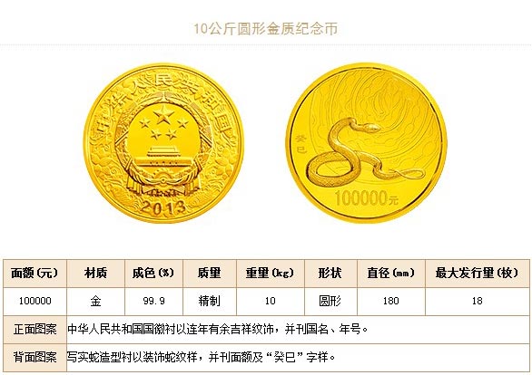 10公斤圆形金质纪念币为精制币癸巳蛇