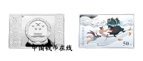 面额(元) 材质 成色(%) 质量 重量(oz) 形状 规格(mm) 最大发行量(枚) 50 银 99.9% 精制 5 长方形 80×50 10000 正面图案 中华人民共和国国徽及中国传统纹样组合设计,并刊国名、年号。 背面图案 张顺活捉黄文炳造型(局部彩色),并刊“张顺活捉黄文炳”中文字样及面额。 - ::商品简介::