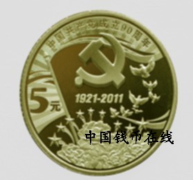 中国共产党成立90周年普通纪念币面额为5元,直径为30毫米,材质为黄铜合金,发行数量6000万枚。