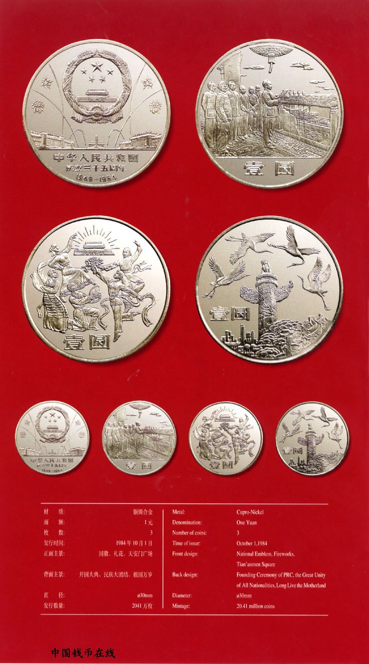 - 正面图案为国徽、天安门广场及礼花、“中华人民共和国成立三十五周年”及“1949—1984”主题文字,背面图案则是华表、松树、仙鹤、长城组成的象征祖国万岁的图案。