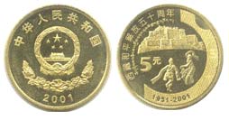 - 正面图案由国徽和五朵牡丹花组成,内缘上方为“中华人民共和国”字样,下方为年号;背面图案则是由布达拉宫、两名藏族男女青年欢庆西藏和平解放五十周年舞蹈场景及面额“5元”字样组成,内缘左侧环排有“西藏和平解放五十周年”汉藏两种文字,右侧为半圆环结合构成的“50”象形字,下方为“1951-2001”字样。