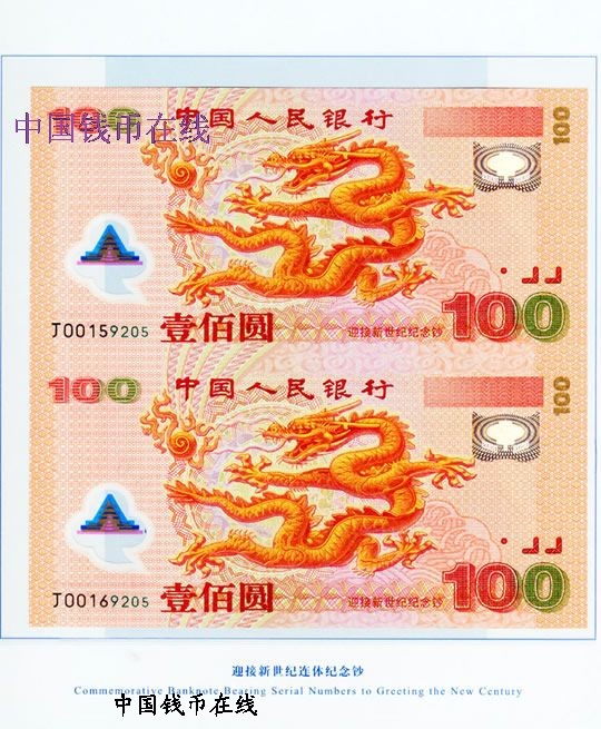 2000年11月28日起 全国发行的《迎接新世纪》纪念钞,是新中国第一套塑料钞票,面额为100元,发行量为1000万套。而龙钞两连体则是两张未裁切的龙钞,发行量仅为10万套。该品种面世十年来,因其的独特的自身优势、良好市场口碑,和较高的大众认同度,被广大收藏者昵称为“双龙钞”。 _2btfY1U