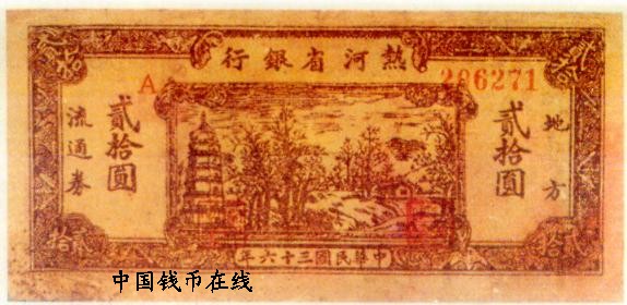 [组图]热河省银行地方流通券   20元         ★★★