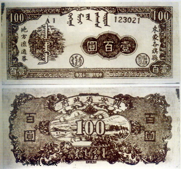[图文]兴安省政府东蒙各旗县地方流通券   100元         ★★★