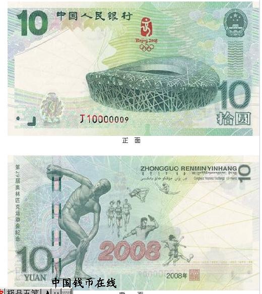 该纪念钞正面主景图案为北京2008年奥林匹克运动会主会场——国家体育场,其上方为第29届奥林匹克运动会会徽图案,背景为天坛图案。票面左上角为光彩光变面额数字“10”,其下方为国家体育场水印图案;票面左下方为盲文面额标记,全息定位镂空标识,双色接线异型号码;票面右侧自上而下分别为中华人民共和国国徽图案,凹印手感线,面额数字“10”与“拾圆”字样。