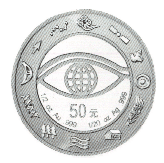 正面图案:中华世纪坛,腾龙;背面图案:象征智慧的眼睛,及人类生存发展要素标志。