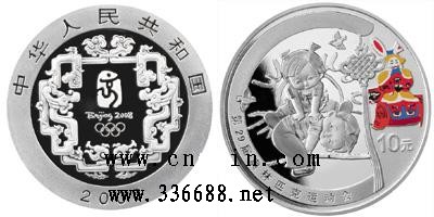 正面图案 第29届奥林匹克运动会会徽图案及中国传统对龙造型,并刊国名、年号“2008”。 背面图案 儿童跳山羊、中国结及兔儿爷,并刊“第29届奥林匹克运动会”字样及面额。