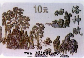 洛神赋图:东晋绘画作品。作者顾恺之。作品以三国魏文学家曹植著名的《洛神赋》为依据,描绘了作者对洛水之神宓妃的爱慕以及神人殊隔、不能交接的惆怅。作品将不同情节置于同一画卷,洛神和曹植在一个完整的画面的不同场景中反复出现,画面和谐统一,丝毫看不出连环画式的分段描写的迹象。