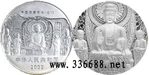 一、金银纪念币图案  (一)正面图案  该套金银纪念币正面图案为龙门石窟奉先寺大卢舍那像龛图,并刊国名、年号及“中国石窟艺术·龙门”中文字样。  (二)背面图案  2盎司纪念银币背面图案为佛像图,并刊面额。二、金银纪念币规格和发行量 2盎司纪念银币为精制币,含纯银2盎司,形状为圆形,直径40毫米,面额20元,成色99.9%,发行量30000枚。
