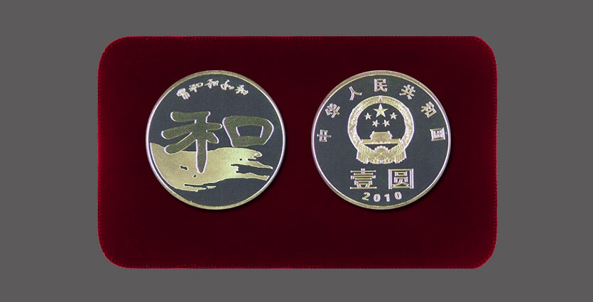 正面图案为国徽,其上方刊“中华人民共和国”国名,下方刊“壹圆”面额和“2010”年号;背面主景图案为隶书“和”字,上方为多种字体书写的“和”字背景以书法的飞白手法衬托