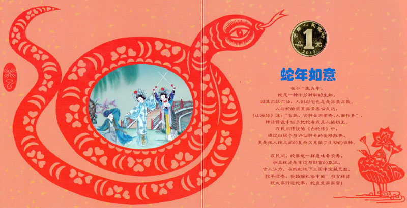 作为贺岁币的装帧卡,“蛇币”装帧卡在设计上延续了传统中式风格,以红黄两色为主要配色,以精美的图形、吉祥饰物等展现出蛇年贺岁的民俗文化,并设计了一幅生动的国画作品,表现了民间传说《白蛇传》的一个片段。