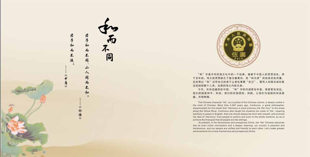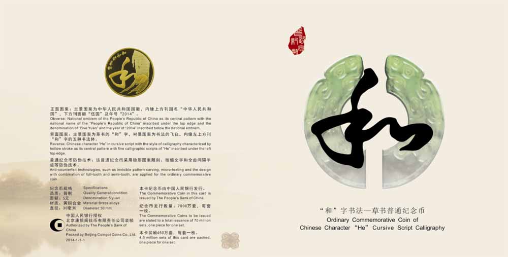 纪念币的主题图案设计:主体为一个行书体的“和”字,左下方为多种字体书写的多个“和”字。