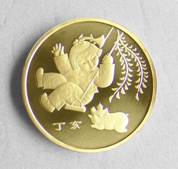 该纪念币背面主景图案为一个荡秋千的小女孩和一只小猪嬉戏的场景,内缘左下方刊“丁亥”字样。