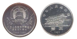 正面图案为国名、北京新华门、年号、面值。背面图案则是鲜花托着政协会徽。