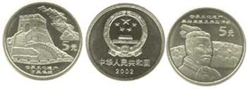 正面主景图案均为国徽,内缘下方依次为“中华人民共和国”国名和“2002”年号;长城币背面主景图案为长城烽火台,内缘右上方为蜿蜒的群山和绵延的长城,右下方为“5元”字样,下方依次为艺术化的长城城墙图案及“世界文化遗产万里长城”字样。兵马俑币背面主景图案为将军俑的特写,其背景为局部的兵马俑坑,内缘上方依次为“世界文化遗产秦始皇陵及兵马俑坑”及“5元”字样。