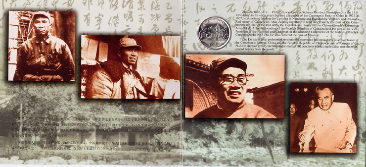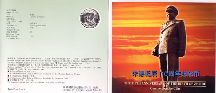 背面图案:主图案是是朱德肖像,上方为“朱德诞辰110周年”及“1886-1996”字样。