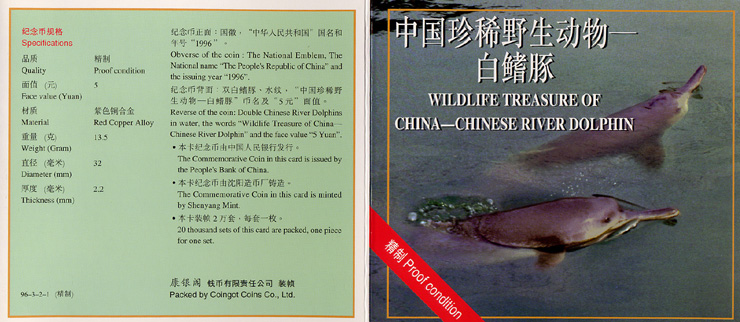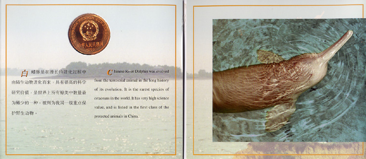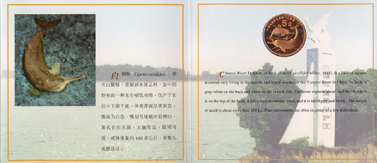 纪念币背面:双白暨豚、水纹,“中国珍稀野生动物——白暨豚”币名及 “5元”面值。