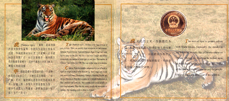 纪念币背面图案:站在岩石上的华南虎,“中国珍稀野生动物——华南虎” 币名及“5元”面值。