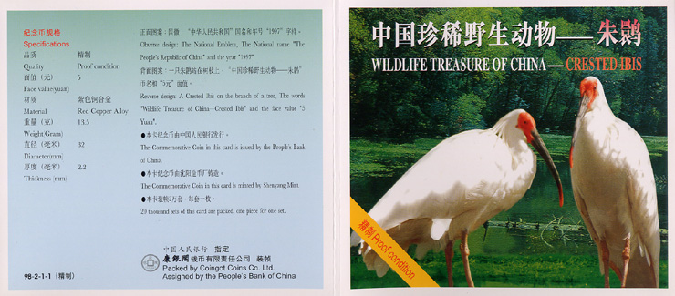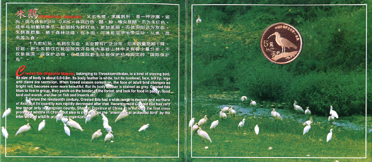 背面图案:一只朱鹮正在树枝上,“中国珍稀野生动物——朱鹮”币名及 “5元”面值。