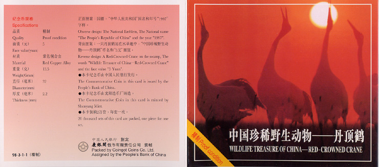 纪念币背面图案:一只丹顶鹤站在水草地中,“中国珍稀野生动物——丹顶鹤”币名及“5元”面值。