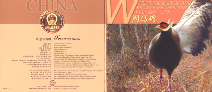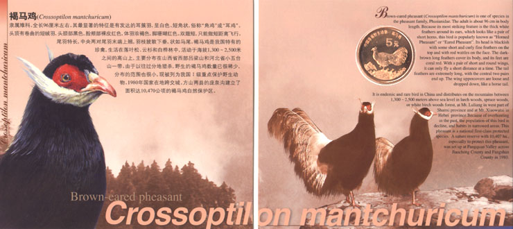 正面图案为国名、国徽、年号。背面图案则是独立于山坡的褐马鸡、面值。
