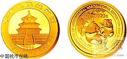 -该纪念币正面图案均为北京天坛祈年殿,并刊国名、年号及“2006中国沈阳世界园艺博览会纪念”。背面图案为双熊猫图,并刊“1/4oz Au .999”字样、 “2006中国沈阳世界园艺博览会纪念”英文字样及面额。