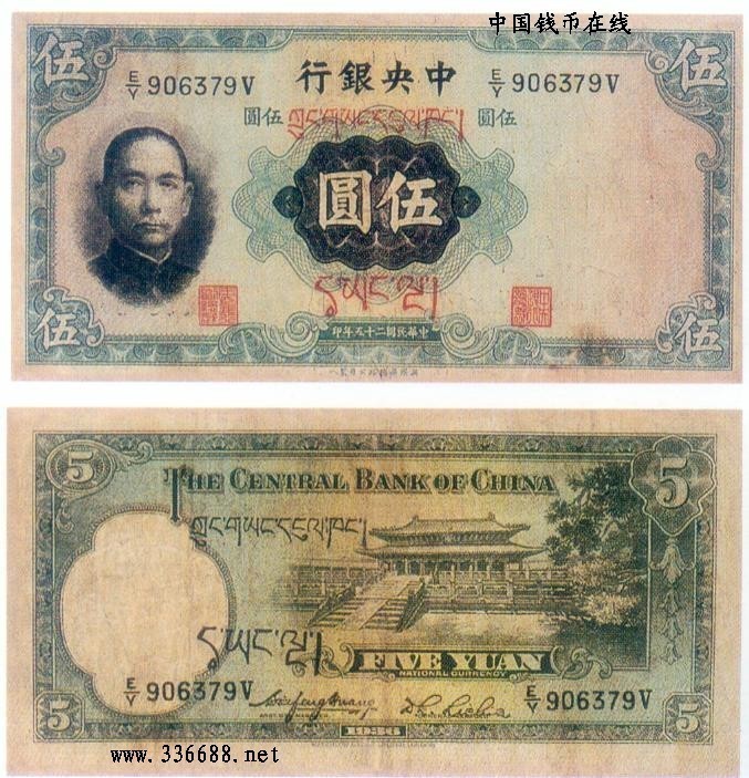 [图文]民国25年中央银行加盖藏文供远征军军用票   5元         ★★★