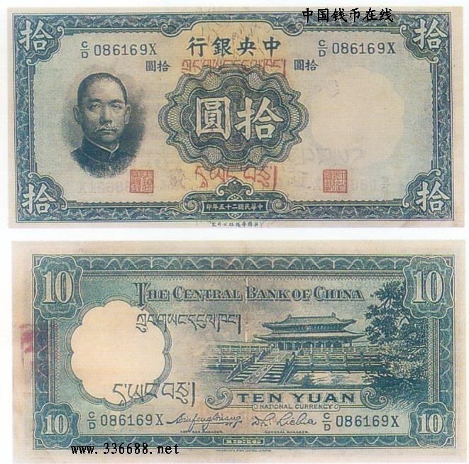 [图文]民国25年中央银行加盖藏文供远征军军用票   10元         ★★★