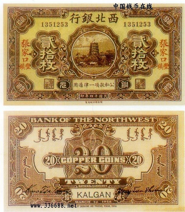 [图文]民国14年西北银行铜圆券   20枚         ★★★
