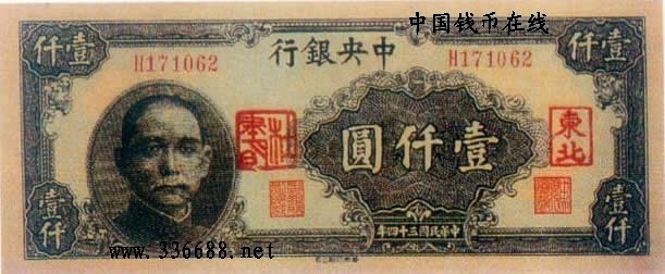 普通军阀时期纸币[抗日战争时期的军用票][图文]民国34年中央银行加盖"东北""杜聿明"军用票  1000元刘扬01-11
