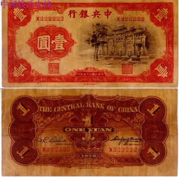 中央银行壹圆“222222”号码