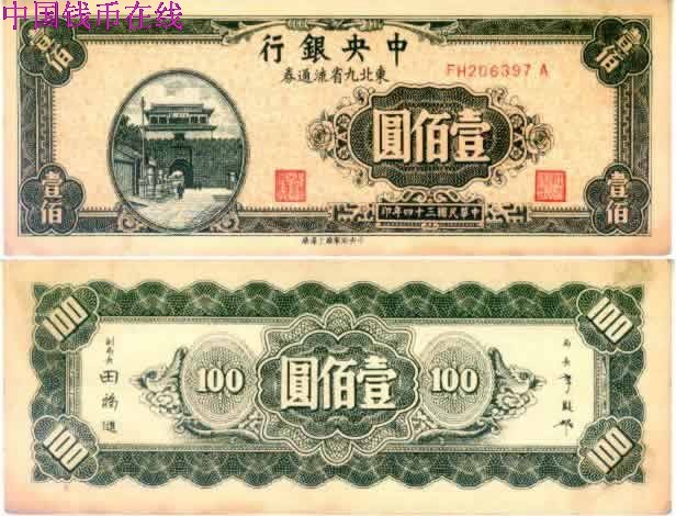 [图文]中央银行东北九省流通券34年100圆