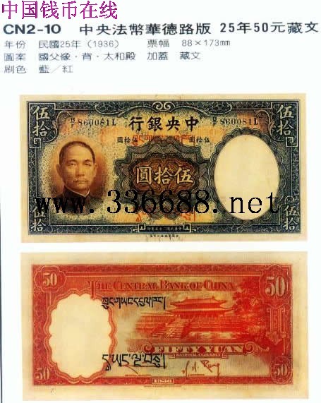 中央法币华德路版   25年50元藏文
