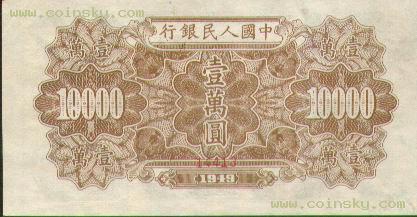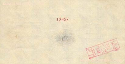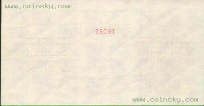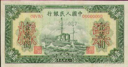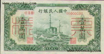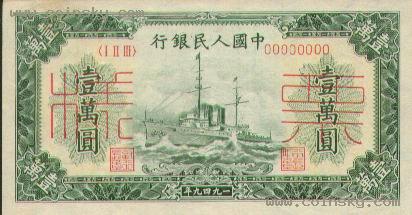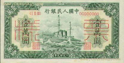 五十六、壹万圆军舰票样有单张式及双张式。单张式:冠字有<I II III> 、<VI V IV>二种,票样字体也有二种。双张式:
