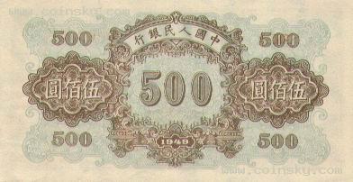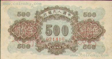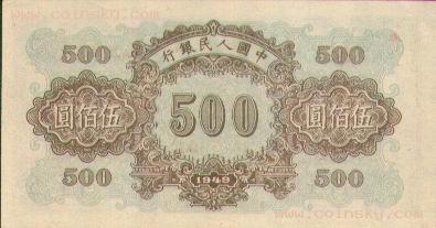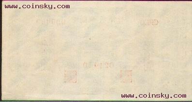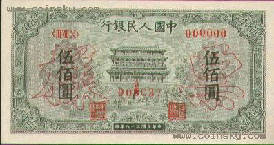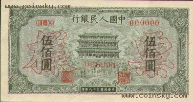 四十、伍佰圆正阳门票样有单张式及双张式,冠字为<III VIII X>,号码为六个0,主要差异在正面图案中央下方号码字体的变化。单张式: