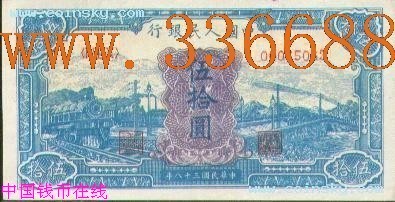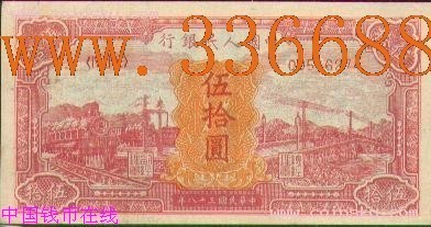(3)伍拾圆红火车大桥:正常券冠字只有<I II III>,号码首位数仅有0、1。发现二张补票,补号券冠字均为<IV II X>,号码分别为00207808、00546274。(注:补号券的存在,对于发行量并无影响,因此本券号码八位数,而首位数只有0、1,推估的发行量仍是不超过二千万张。)