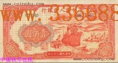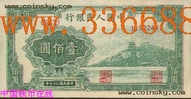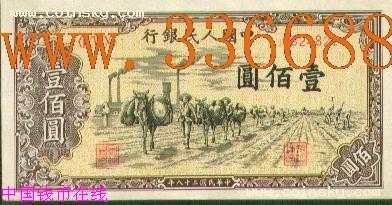 (8)壹佰圆运输(别称驮运):个人收藏此票券冠字除了官方公布<I II III>→<IV II X>一百二十个中已有117个外,尚有<I II IV>和<I II V>二小组之中的十一个冠字;由此得知,本券目前已知的末位冠字为<V I II>,发行量推估为(120+11)×10000000=13亿1千万张。发现五张背“H”版的运输券补票,补号券冠字<IX VII X>,号码分别为0415635、0966794、1075075、1120539、0824821;三张普通版,补号券冠字为<IX X VII>,号码分别为2251974、2322412、3452004;一张背“H”版,补号券冠字为<IX X VII>,号码为0420360。本券的印制单位有二种说法(A)中国金融出版社出版的《当代中国货币印制与铸造》一书认为是中原(汉口)印钞厂生产(B)沈阳造币厂出版的《东北解放区印钞简史》一书指出东北银行工业处管辖下的佳木斯印钞厂和沈阳造币厂都有生产。因此这二张补票的发现目前尚无法证明是属于哪一个厂的“补号券”,尚待日后更多实物资料的出现,再作定论。实际上,目前坊间出版有关第一套人民币的书籍中,对各券种的发行时间、印制工艺、印制单位…等诸多问题,都存在或多或少的矛盾,甚至令人百思不解;这唯有期待官方未来【比较正确】的档案资料公布才能得到真正的解答。