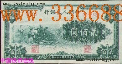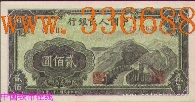 (10)贰佰圆长城:正常券冠字有<I II III>→<II III IV>七个。发现八张补票,补号券冠字均为<I IV II>,号码分别为25726397、36636923、41806647、44011033、44011034、46562133、53497345、68254946。1949年5月27日,上海全市解放,5月29日上海印钞厂立即使用解放区带来的印版,最先开印本券,是否因而造成此补号券的冠字<I IV II>与壹佰圆轮船<IX X VII>不同,以及推估废品率(68254946÷700000000=9.75%)偏高有关?还是作业疏忽,误把下一个冠字<II IV III>印成冠字<I IV II>,真相有待进一步查证。