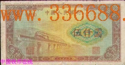 (7)伍仟圆渭河桥:正常券冠字目前已知有<I II III>→<VIII VII VI >三十六个。发现一张补票,补号券冠字为<IX X VII>,号码为5721771。以此估算此券的废品率约为1.589%左右(按:废品数量除以总发行量再乘上百分之一百即得之,亦即﹝5721771÷360000000﹞×100%)。从实物资料证明北京印钞厂1953年以后印制第一套人民币的补票单列冠字为<IX X VII>。