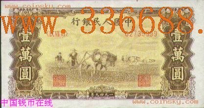 (11)壹万圆双马耕地:正常券冠字有<I II III>→<IV III II>十二个。发现一张补票,补号券冠字为<IX VII VI>,号码为02739899,此券纸张为黑五角星水印。以目前现有的档案及实物(9)~(11)的资料,尚无法针对上海印钞厂补号券冠字的来龙去脉提供一个比较客观明确的答案。