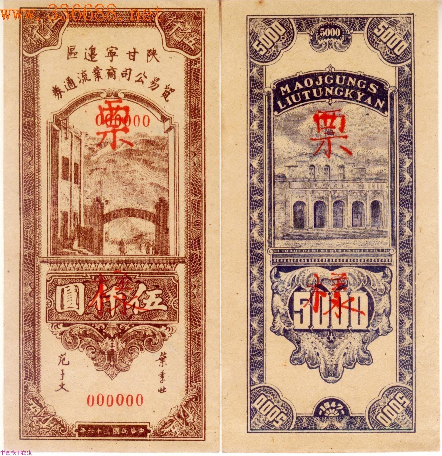 普通精品钱币[图文]陕甘宁边区贸易公司商业流通券5000圆样票刘扬01-22