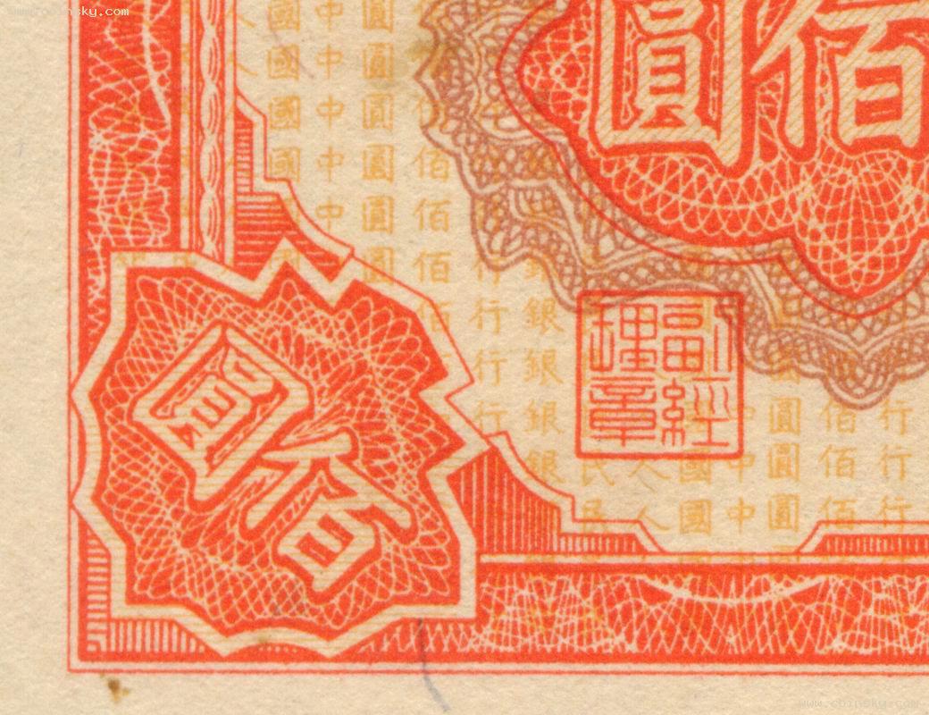 壹佰圆轮船真假局部对照图(六):上:A为真票;下:B为新假票,C为老假票一式,D为老假票二式。 A: