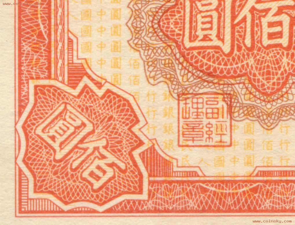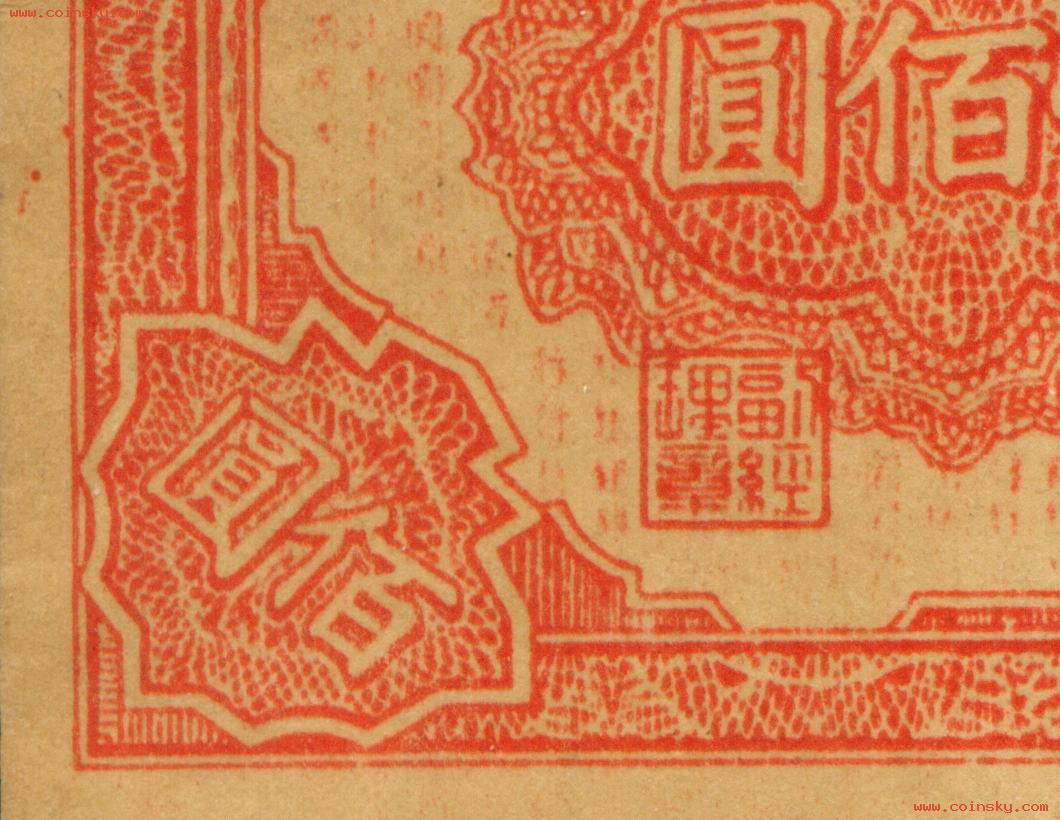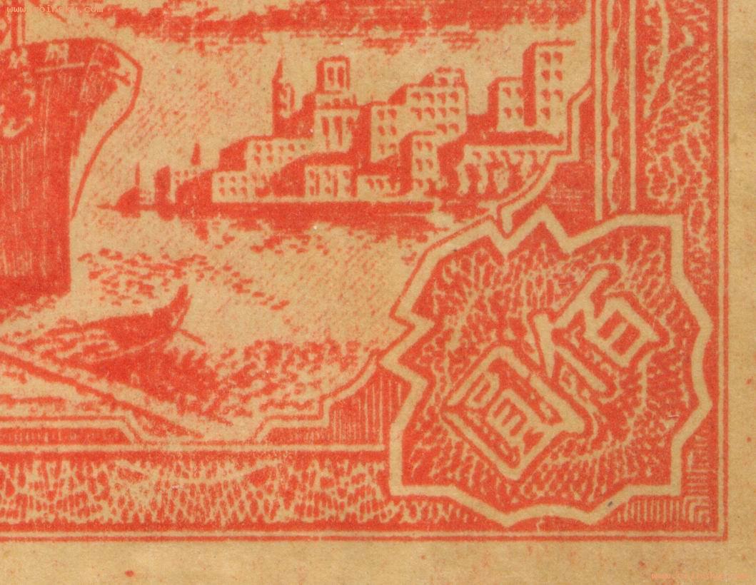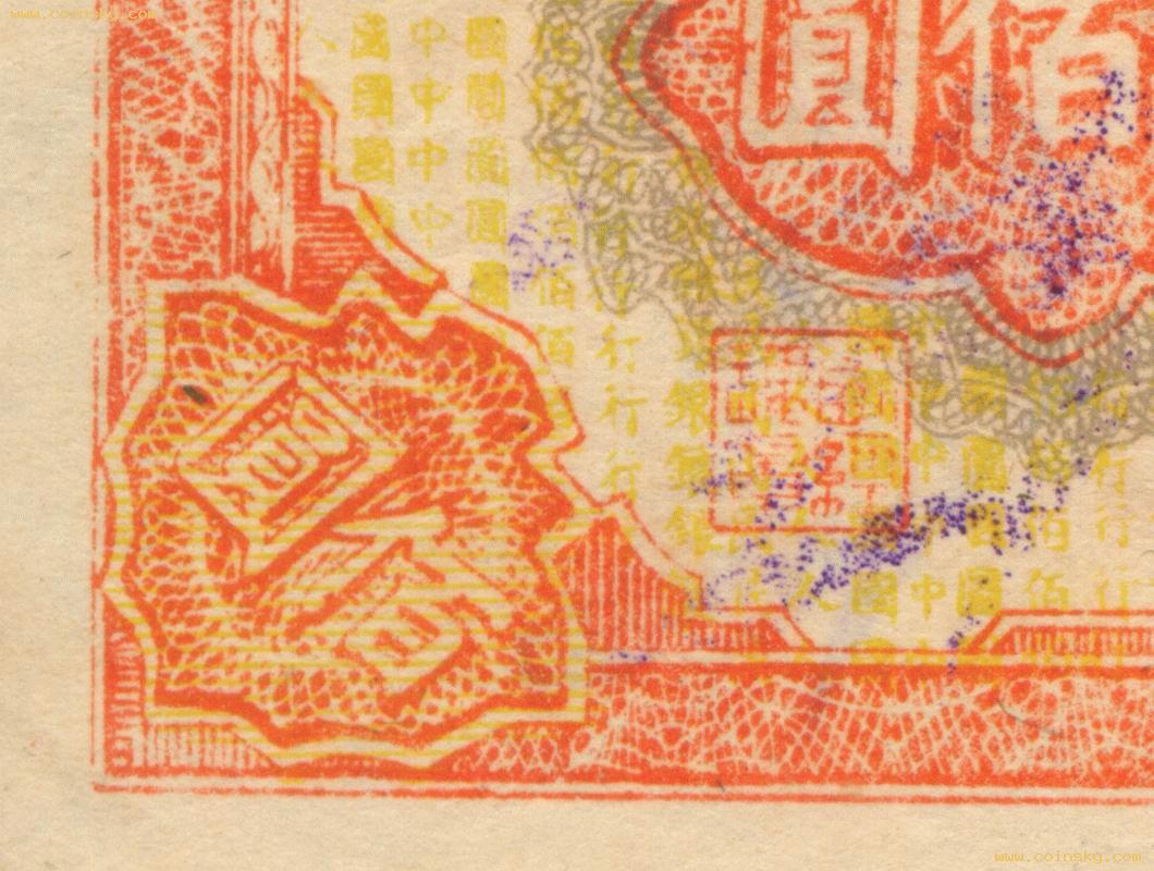 壹佰圆轮船真假局部对照图(五):上:A为真票;下:B为新假票,C为老假票一式,D为老假票二式。 A: